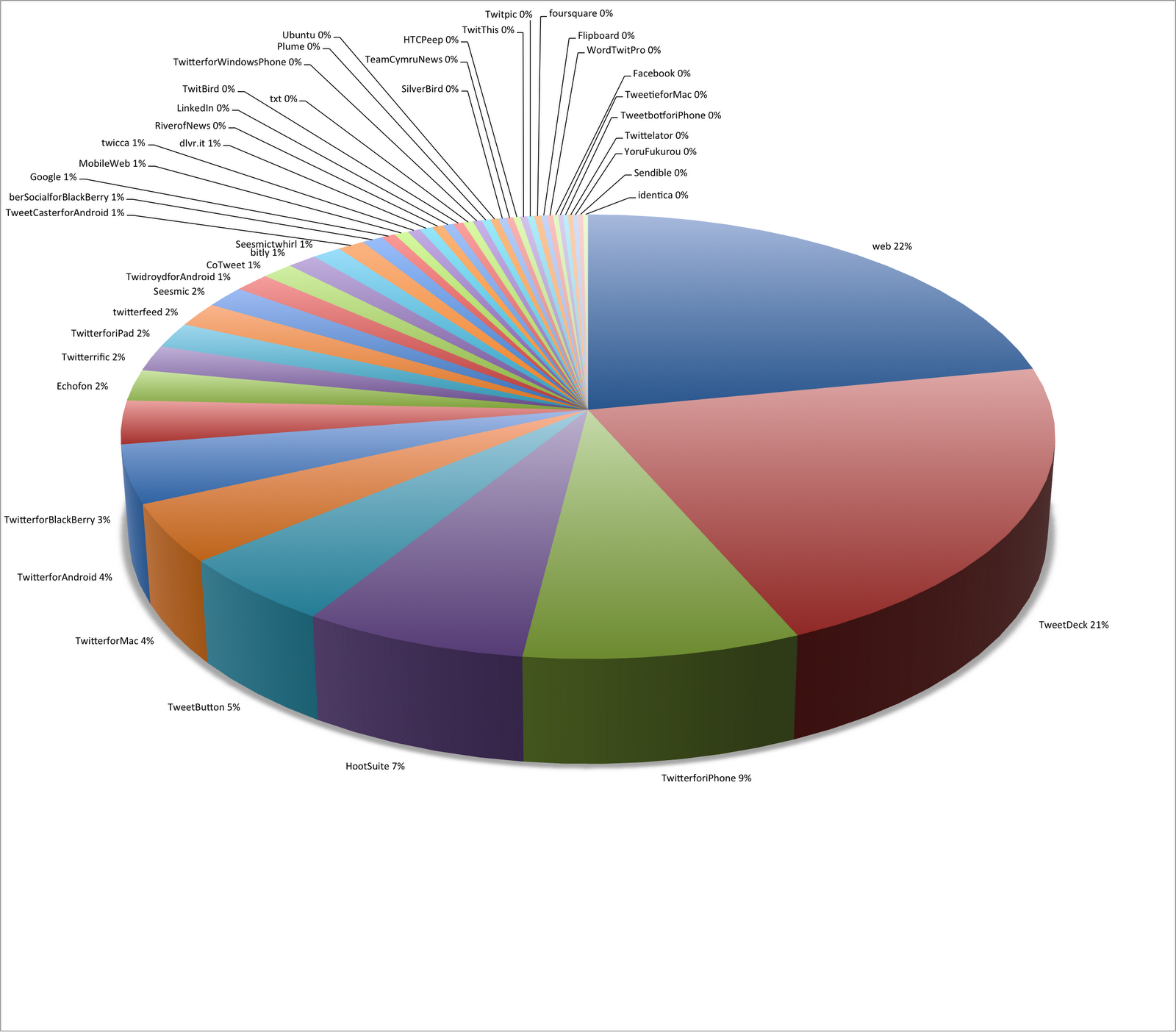 Finally (because we couldn’t help but add another pie graph,) we can check the most popular twitter clients used to create this traffic: