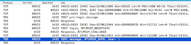 | Initial packet capture: upgrading to encrypted connection begins after initial pre-login messages |