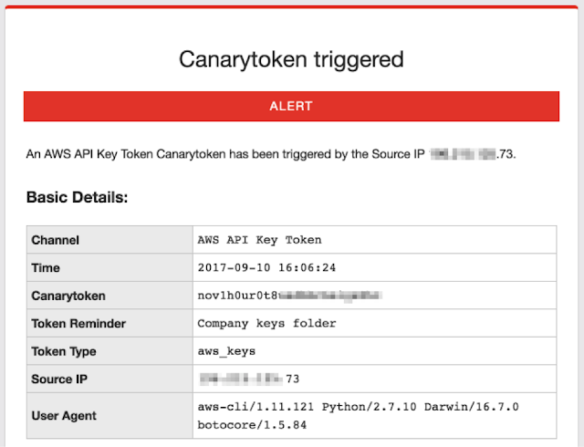 The AWS API key Canarytoken allows the creation of real AWS API keys which can be strewn around your environment. An attacker using these credentials will trigger an alert informing you of his presence (and other useful meta information).. It’s quick, simple, reliable and a high quality indicator of badness.