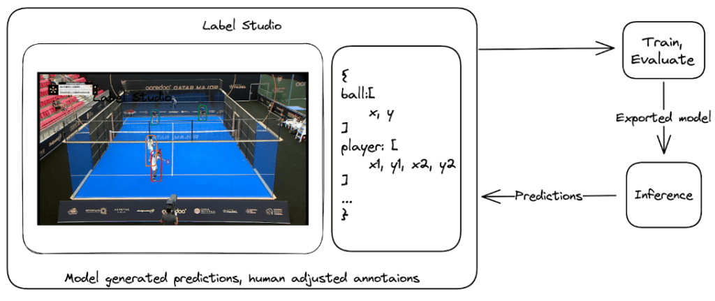 There are a plethora of off-the-shelf models that can do object detection however, none have single class “padel ball” detectors. Fine-tuning such a model is fairly common and to achieve this a few annotated frames were needed. LabelStudio is a very versatile data labeling tool that makes it easy to “put a model in the loop”. By doing this we bootstrapped our ball detector by repeatedly annotating more images and each time using the latest model to automatically label the additional images that were manually verified and corrected.
