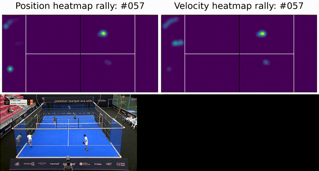 The ultimate goal of such a system is to provide insights into game play and strategies. To this end we show court occupation and player movement speeds. The position and velocity heatmaps of players during a rally. The bottom image has Team A in the foreground and Team B in the background. Here we can see where players were during the rally as well as how they moved. In this rally we can see Team A (on the left) plays from deep while Team B (on the right) occupies the mid court far more. Translating this raw positional information into actionable insights remains as future work.