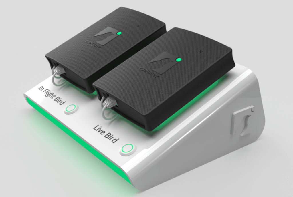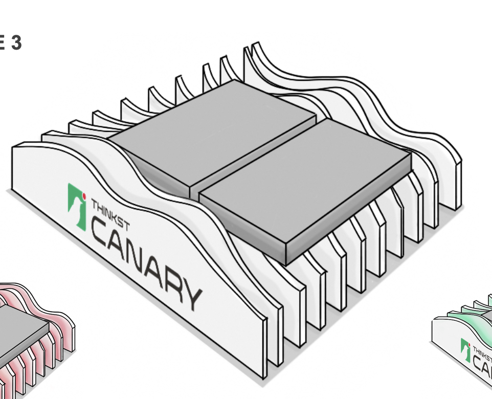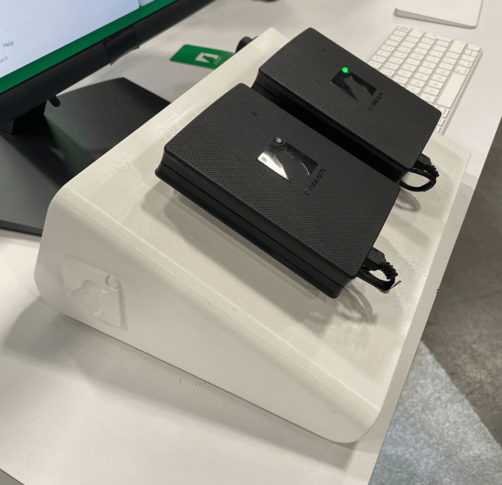 Our booths have several demo stations, and on every demo stations we have two Canaries. Each bird serves a particular purpose: one is always live and ready to go, and the other is in the in-flight state waiting to demo how the Canary is shipped to Customers. In our early booths, the Canaries simply lay flat on the table surface next to the demo laptop. It encouraged people to try to pick them up, but this caused brief panic because the Canaries were plugged in. So we needed a better solution.