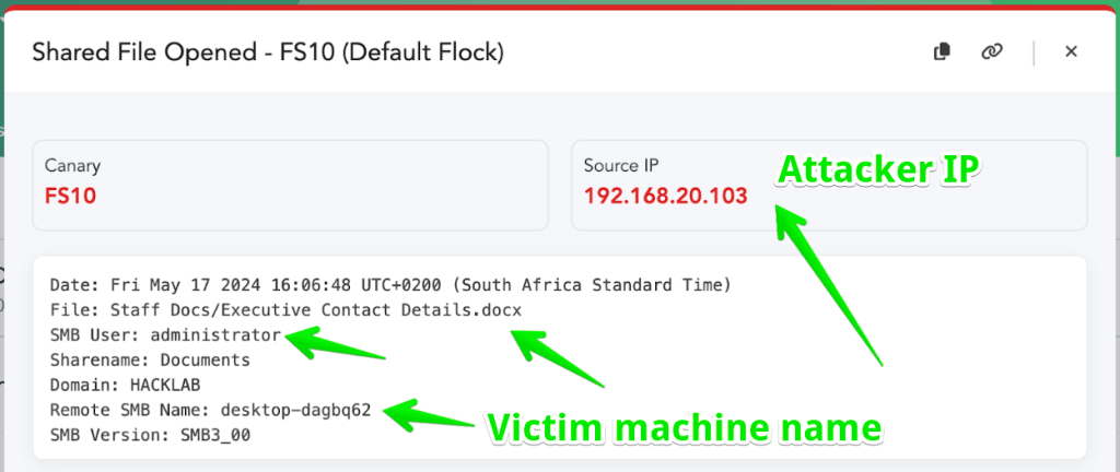 When an attacker connects to a file share, the source IP would correlate to the “Remote SMB Name”. In other words, if we were to perform a netbios lookup for “192.168.20.103” it would reveal the attackers hostname.
