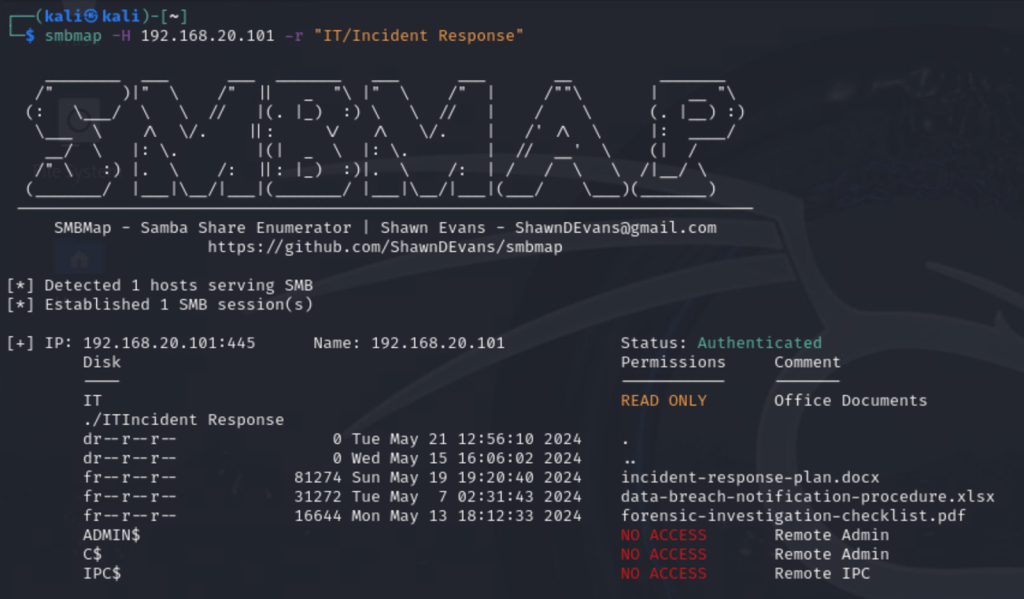 $ smbmap -H 192.168.20.101 -r "IT/Incident Response"[*] Detected 1 hosts serving SMB[*] Established 1 SMB session(s)[+] IP: 192.168.20.101:445 Name: 192.168.20.101 Status: Authenticated Disk Permissions Comment ---- ----------- ------- IT READ ONLY Office Documents ./ITIncident Response dr--r--r-- 0 Wed May 8 09:42:00 2024 . dr--r--r-- 0 Fri Apr 26 06:13:52 2024 .. fr--r--r-- 80371 Sun May 12 18:36:30 2024 incident-response-plan.docx fr--r--r-- 65258 Wed May 15 16:13:50 2024 data-breach-notification-procedure.xlsx fr--r--r-- 14101 Tue May 14 23:36:52 2024 forensic-investigation-checklist.pdf