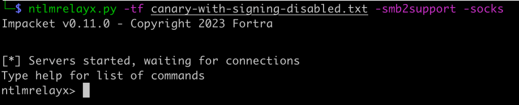 The attacker identifies a file share that has SMB signing disabled (aka your Canary). Using ntlmrelayx, the Canary’s IP address and the “-socks” flag, the attacker is able to interact with the relayed connection via a socks proxy.