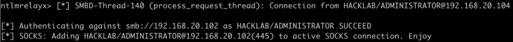 Once a connection from the victim machine is established, we can observe the active socks session within ntlmrelayx.