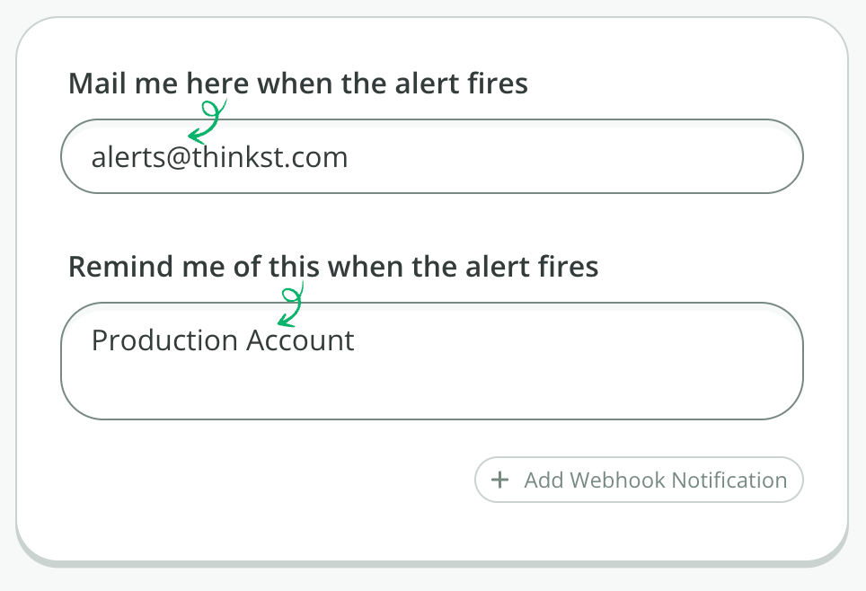 For the alert details, enter an email address where we’ll send the alert, and a reminder message we’ll include in the alert. We recommend a description of the AWS account, so you quickly can tell which account was affected: