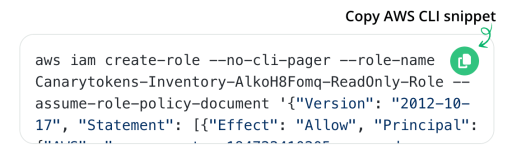 The next screen shows three AWS CLI commands, which you need to run in the authenticated AW CLI session. Click “Copy AWS CLI snippet”, and paste into your shell:These commands will create a new IAM Policy, a new IAM Role, and attach the role to the policy. This will allow Canarytokens.org to fetch the names of certain asset types in your account, in order to generate decoys with similar names. The policy contains the asset types we list, and is a least-privilege policy. For example, it allows us to list your current S3 bucket names, but not read anything inside the buckets (including object names). Ditto for DynamoDB tables, SSM Parameters, SecretsManager secrets, and SQS Queues.